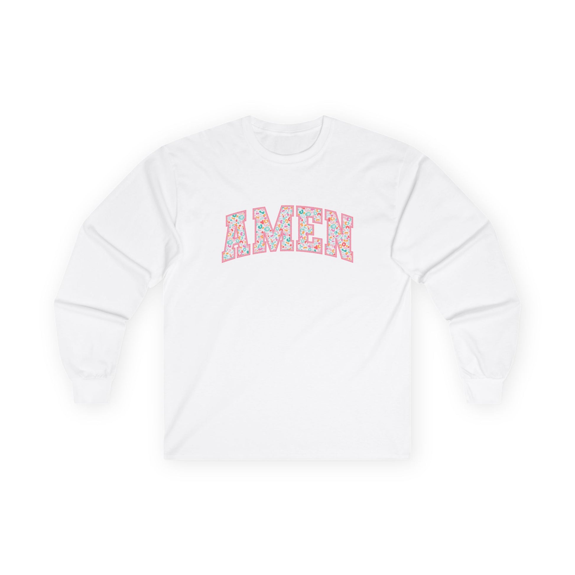 Soft, vintage-bodied long sleeve printed tee with a calming, hand-lettered 'AMEN' across the chest. The letters wear a subtle floral pattern in muted pinks and greens that reads gentle and reverent — like a quiet breath after a Sunday service or a slow walk through a spring garden. The medium-weight cotton has a worn-in feel that settles comfortably on the shoulders. Wear it on cool mornings with jeans and boots, layered under a denim jacket for evening gatherings, or at low-key community events where warmth and quiet confidence matter more than flash. It sits like a familiar hymn: understated, sincere, and well-loved.
