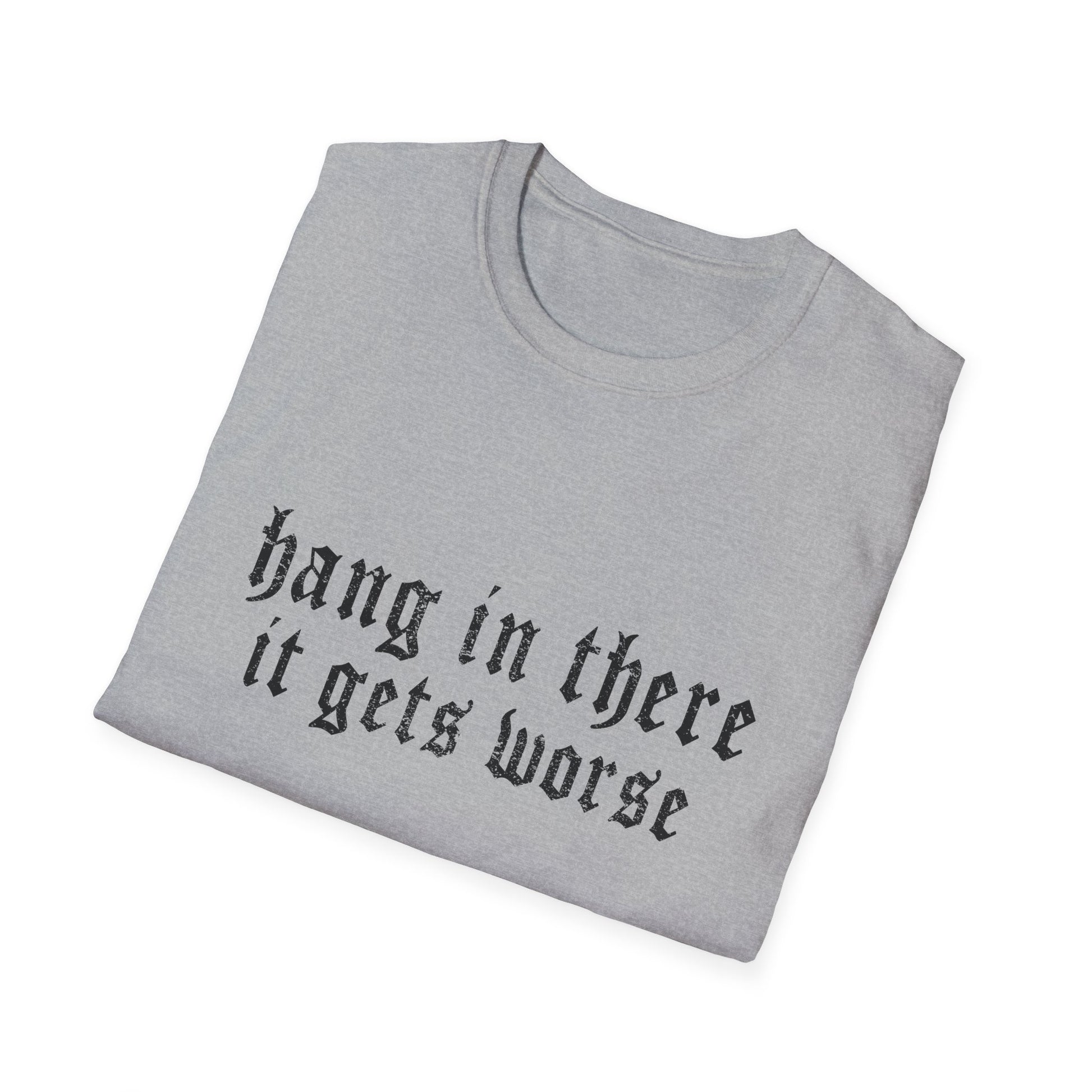 Introducing the perfect addition to any wardrobe: a Unisex Softstyle T-Shirt that brings comfort and style together. This versatile shirt features a clean, classic fit ideal for everyday wear, whether dressed up for a night out or relaxed for a casual weekend. Its uplifting message "hang in there, it gets worse" makes it a great conversation starter and a lighthearted reminder to embrace life’s challenges. Perfect for adults of all ages, this shirt can serve as a thoughtful gift for those facing tough times or as a cheeky treat for yourself. It’s an ideal choice for casual outings, birthdays, or as a lighthearted gift during holidays like Christmas and Thanksgiving, where finding the perfect blend of humor and comfort is essential. Dress it up with accessories or wear it solo—this shirt is designed to fit seamlessly into any lifestyle, ensuring you feel good while expressing authenticity.