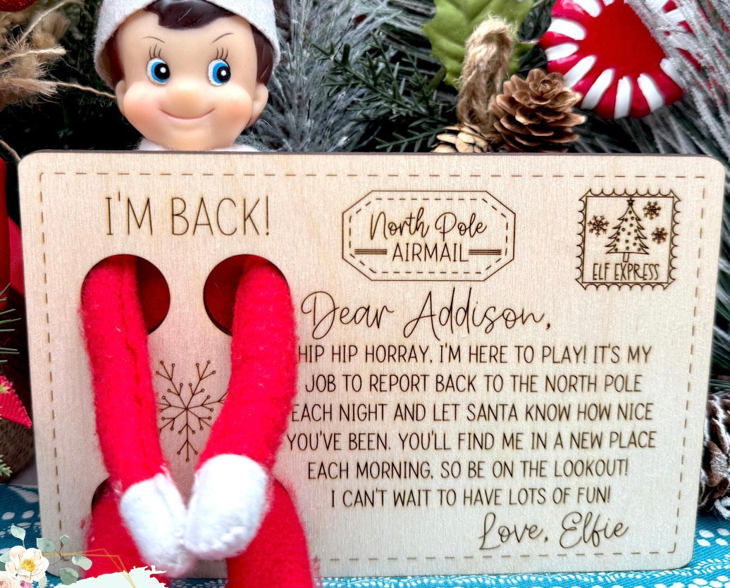 Welcome your elves back from the North Pole with this adorable “We’re Back!” wooden sign! Perfect for your Elf on the Shelf tradition — just slide your elves’ arms through the holes and create a magical holiday display your kids will love.