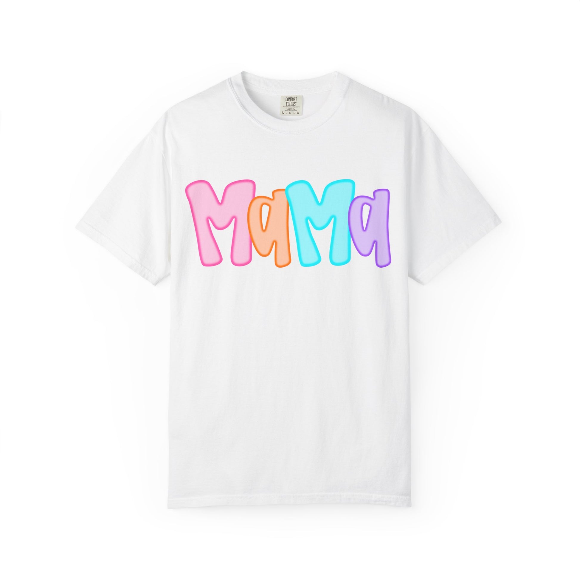 Soft, heavyweight cotton with a lived-in feel meets bright, joyful lettering — this relaxed tee reads 'Mama' in bubbly, candy-colored letters that look hand-painted. It settles into the shoulders and softens with each wash, giving a cozy, worn-in comfort while keeping that playful, proud message front and center. Wear it on slow mornings with coffee and little feet at your ankles, layered over leggings for park runs, or as an easy, colorful top for weekend errands. The garment-dyed finish gives the fabric a subtle texture and depth of color that plays well with the cheerful design, so the shirt feels personal from day one.