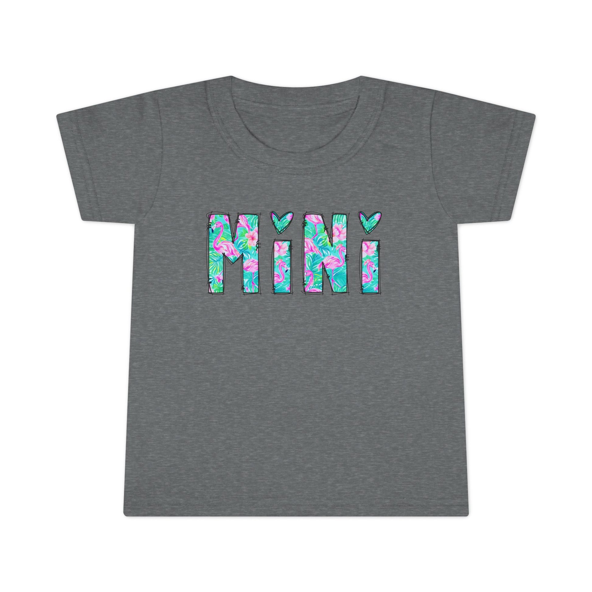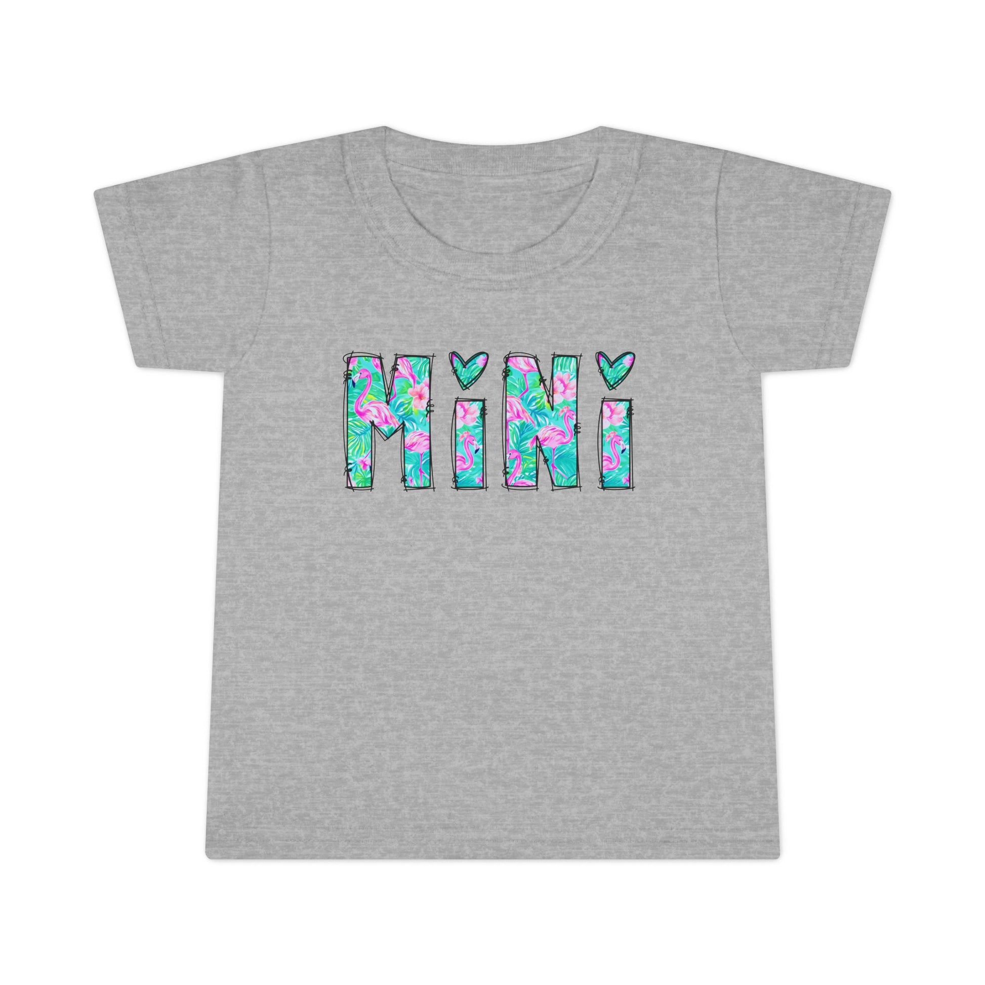Soft, light, and full of childhood whimsy — this toddler tee features bright, watercolor-like block letters spelling “MINI” with three little hearts tucked above. The gentle grey fabric lets the playful aqua, pink, and teal pattern pop, while the classic cut and taped shoulders keep small rompers and run-around days comfortable. It’s a cheerful everyday piece that layers easily under jackets or pairs with favorite shorts for park mornings and family photos alike.