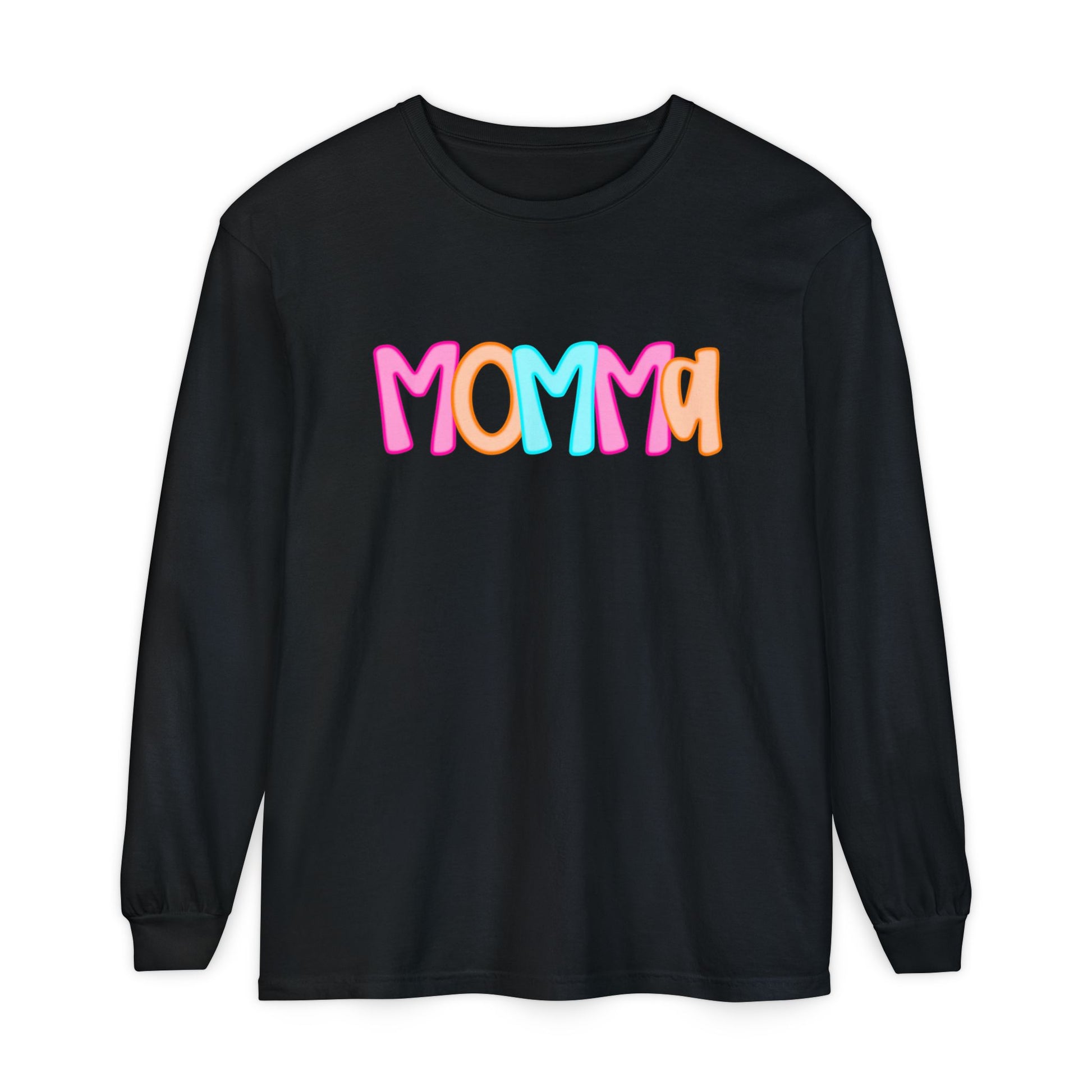 Soft, lived-in long sleeve that reads like a warm note from home. The playful, rounded “MOMMA” lettering pops in candy-bright colors against a garment-dyed fabric that feels broken-in from day one. Wear it on slow mornings with coffee, on playground runs, or layered for chilly evening walks. The classic fit and medium-weight cotton give this shirt structure without stiffness — breathable, durable, and quietly comfortable. It settles into your routine and keeps its shape thanks to reinforced seams and ribbed cuffs, so it looks as familiar after many washes as it does the first time you put it on.
