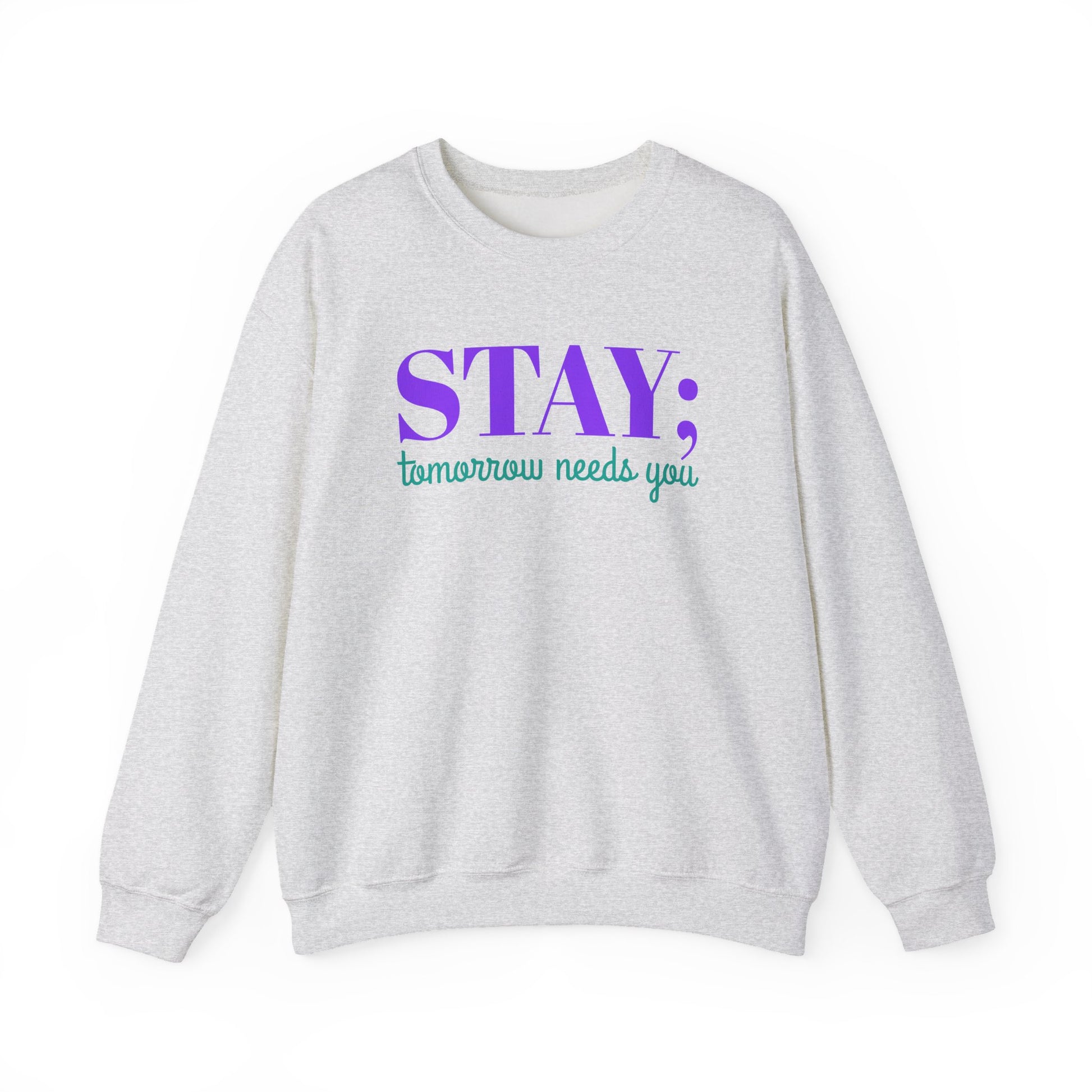Embrace warmth and positivity with this Unisex Heavy Blend™ Crewneck Sweatshirt, perfect for cozy days and inspiring moments. The uplifting message 'STAY; tomorrow needs you' serves as a gentle reminder to appreciate the present and look forward to the future. Ideal for casual outings, lounging at home, or running errands, this sweatshirt effortlessly fits into your daily routine. It’s a great gift for friends, family, or anyone who could use a boost of encouragement. This versatile piece suits various occasions such as birthdays, holidays, or just as a thoughtful surprise on a regular day. With its classic fit and soft fabric, it brings comfort and style together, making it a must-have in your wardrobe.
