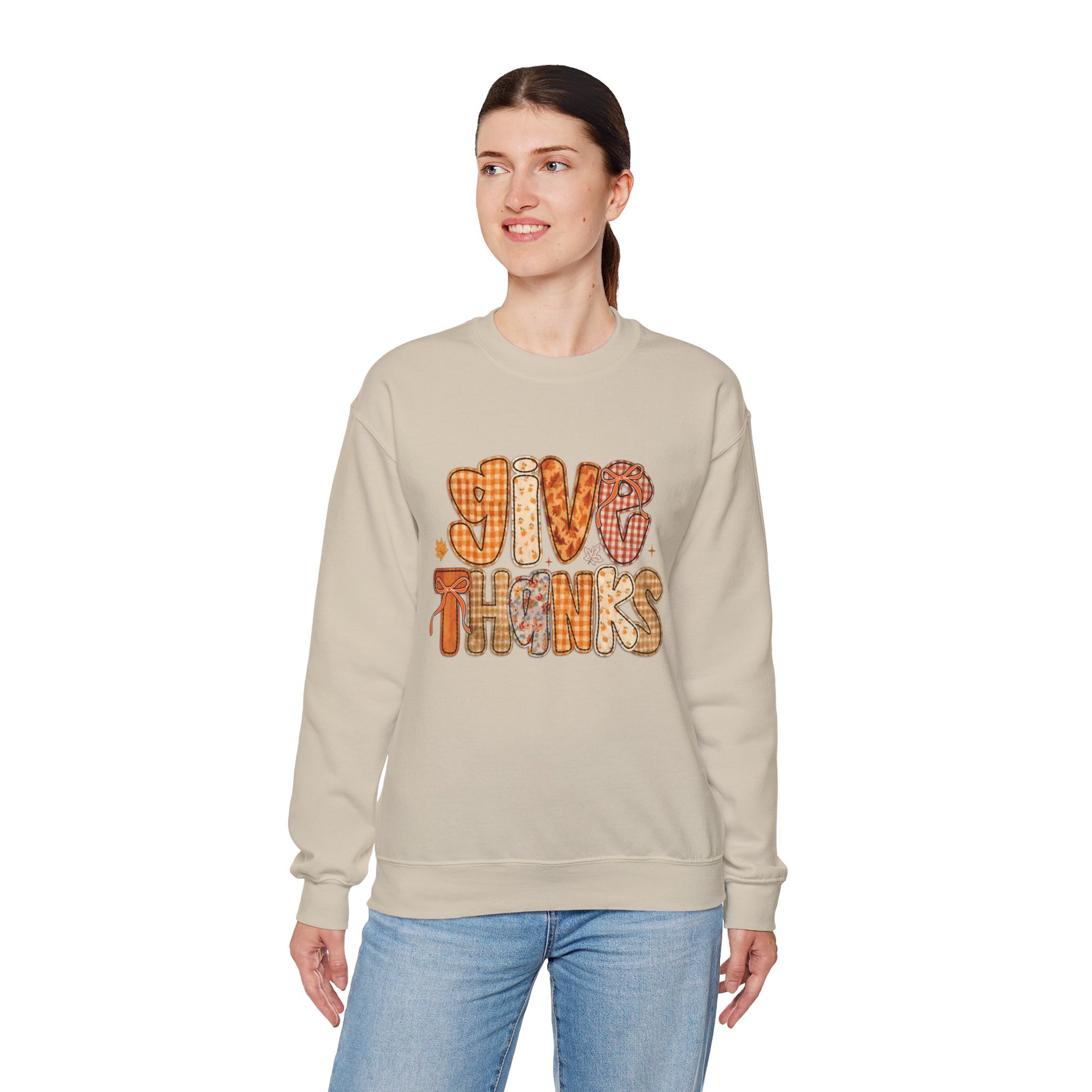 Embrace cozy vibes with this unisex heavy blend crewneck sweatshirt. Perfect for chilly days, it exudes warmth and comfort, making it an ideal addition to your wardrobe. The eye-catching design featuring "GIVE THANKS" brings a joyful atmosphere, perfect for celebrating Thanksgiving or just spreading positivity. This sweatshirt is a fantastic gift for friends or family who appreciate both style and comfort. It's suitable for casual outings, cozy nights in, or cozy gatherings, making it a versatile staple for anyone's closet.